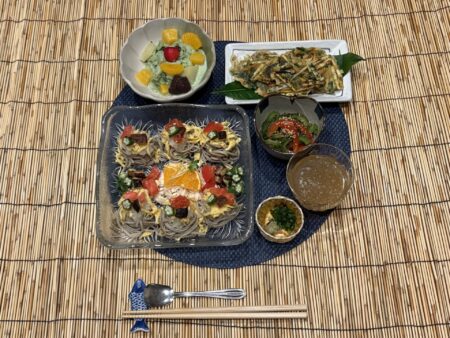 【奄美の鶏飯風つけそば】今年は特に暑さの続く日が多かったため、郷土料理の鶏飯のアレンジで、鹿児島県民が大好きなそばと新鮮な夏野菜をさっぱりとした鶏がらスープのつけ汁で食べるメニューを考えました。また、スープは塩分が多いため、つけそばにしてスープを飲み干さないように工夫をしました。
