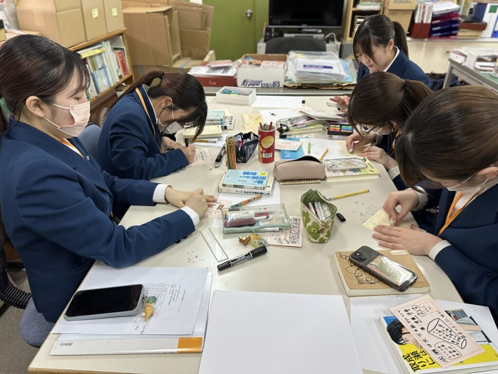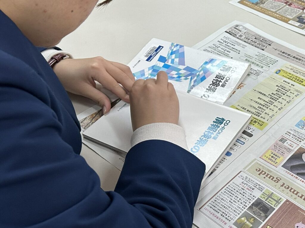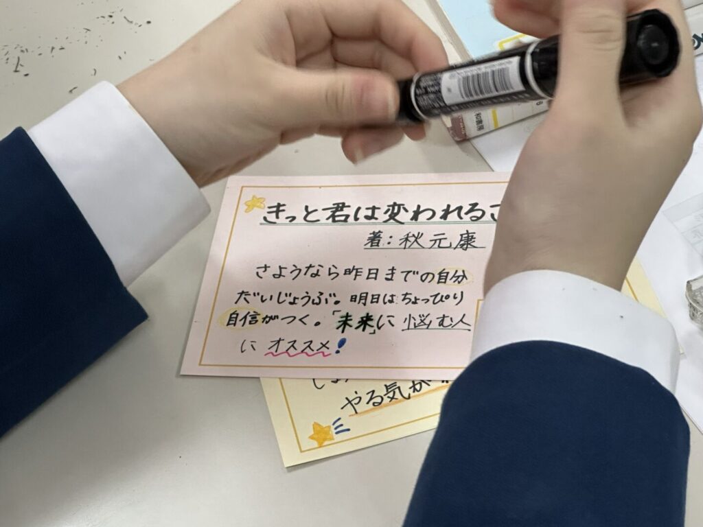 POP作成作業では、本の魅力を分かりやすく伝える工夫について学びました。読者が「読んでみたい」と思えるような言葉選びやレイアウトが大切だと感じました。イラストや色の使い方によって本の雰囲気を表現できることも知り、本を紹介する楽しさを知ることができました。